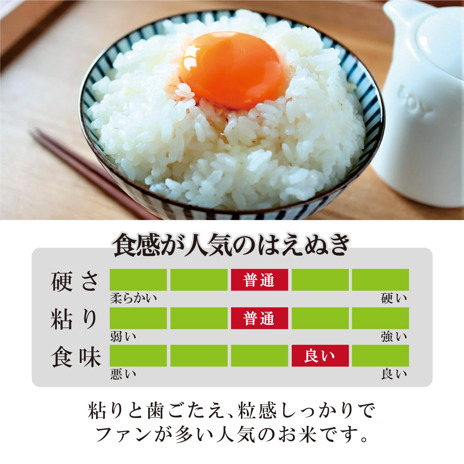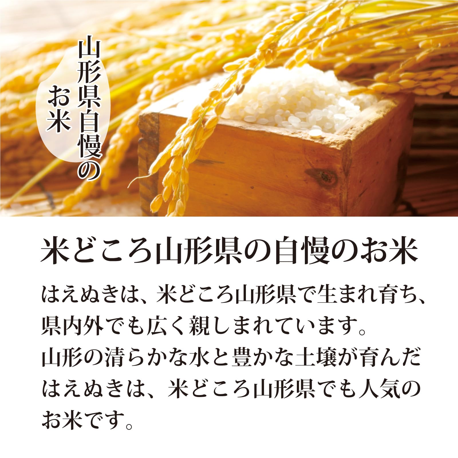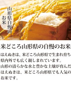 平成4年にデビューした山形生まれのお米。絶対的な品質の高さを狙った『ユメのコメ』として、10年の歳月をかけて研究・育成された山形県オリジナル品種です。「はえぬき」は、収量・品質が安定していることから、いもち病に弱く倒れやすかった「ササニシキ」に代わり、瞬く間に県の主力品種に駆け上がりました。 また、「コシヒカリ」や「ササニシキ」「あきたこまち」などのおいしさを受け継いでおり、米の食味ランキングでも最高位の「特A」を22年連続獲得! 全国トップクラスのおいしいお米です。