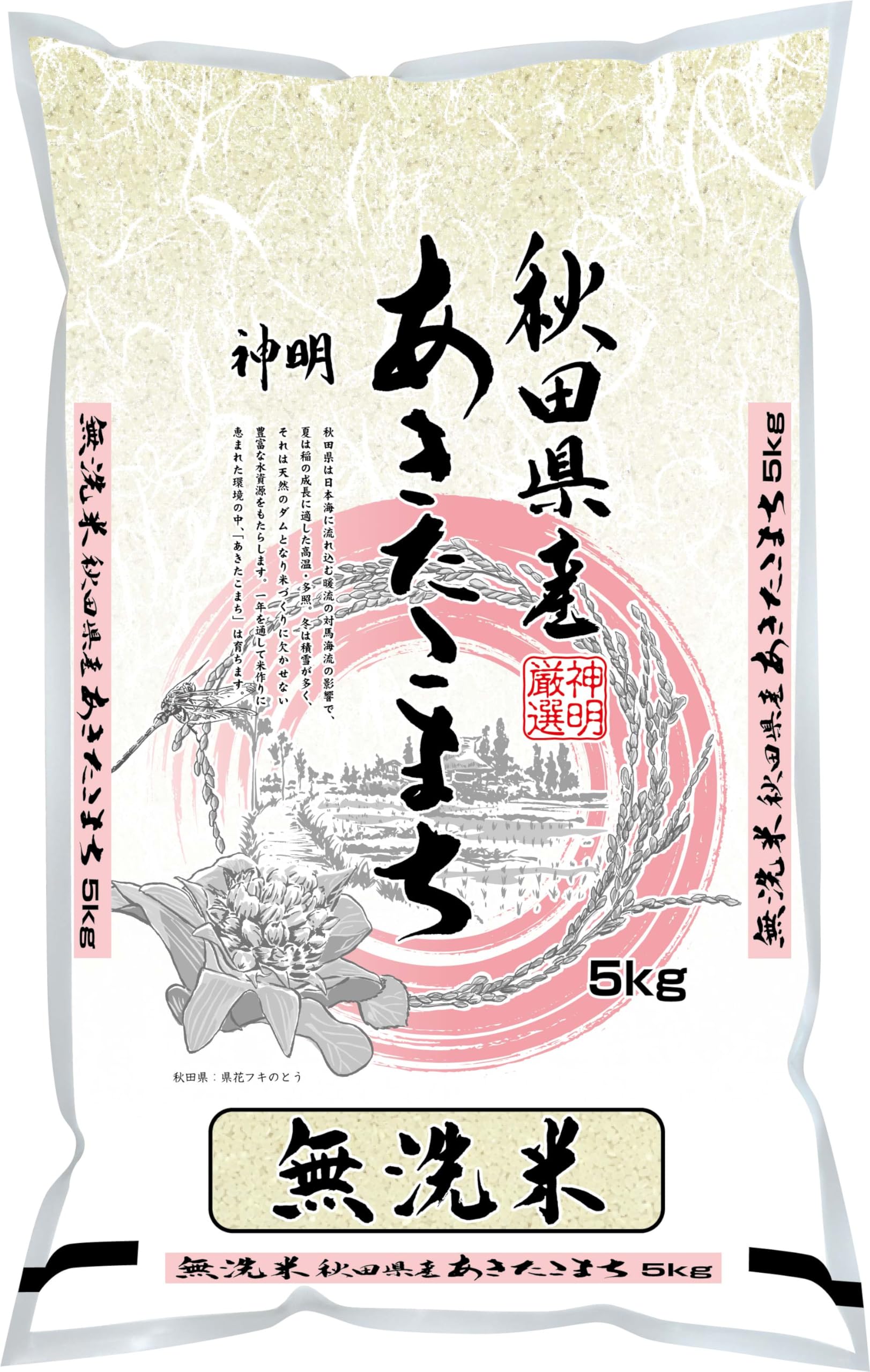 東北で最初の「コシヒカリ」系統の食味を持つ良質・良食味米品種。炊飯米は透明感、光沢、香り共に優秀で粘りが強く弾力に富んでいるという特徴がある。秋田は、西は日本海に面し対馬海流の恵で暖流である。東は南北に連なる奥羽山脈が「ヤマセ」をさえぎり、山越えした寒風はフェーン風に変わって、8~10℃気温が高くなる。また、大部分の田んぼは盆地の中にあって昼と夜の温度差が大きく稲の育ちと実りに好適な条件を揃えている。あかふじ米は神明が全精力を注ぎ込んで造っているブレンド精米で、独自の技術と経験に基づいてブレンドすることにより、年間を通じて安定した品質を保つことができると考えております。